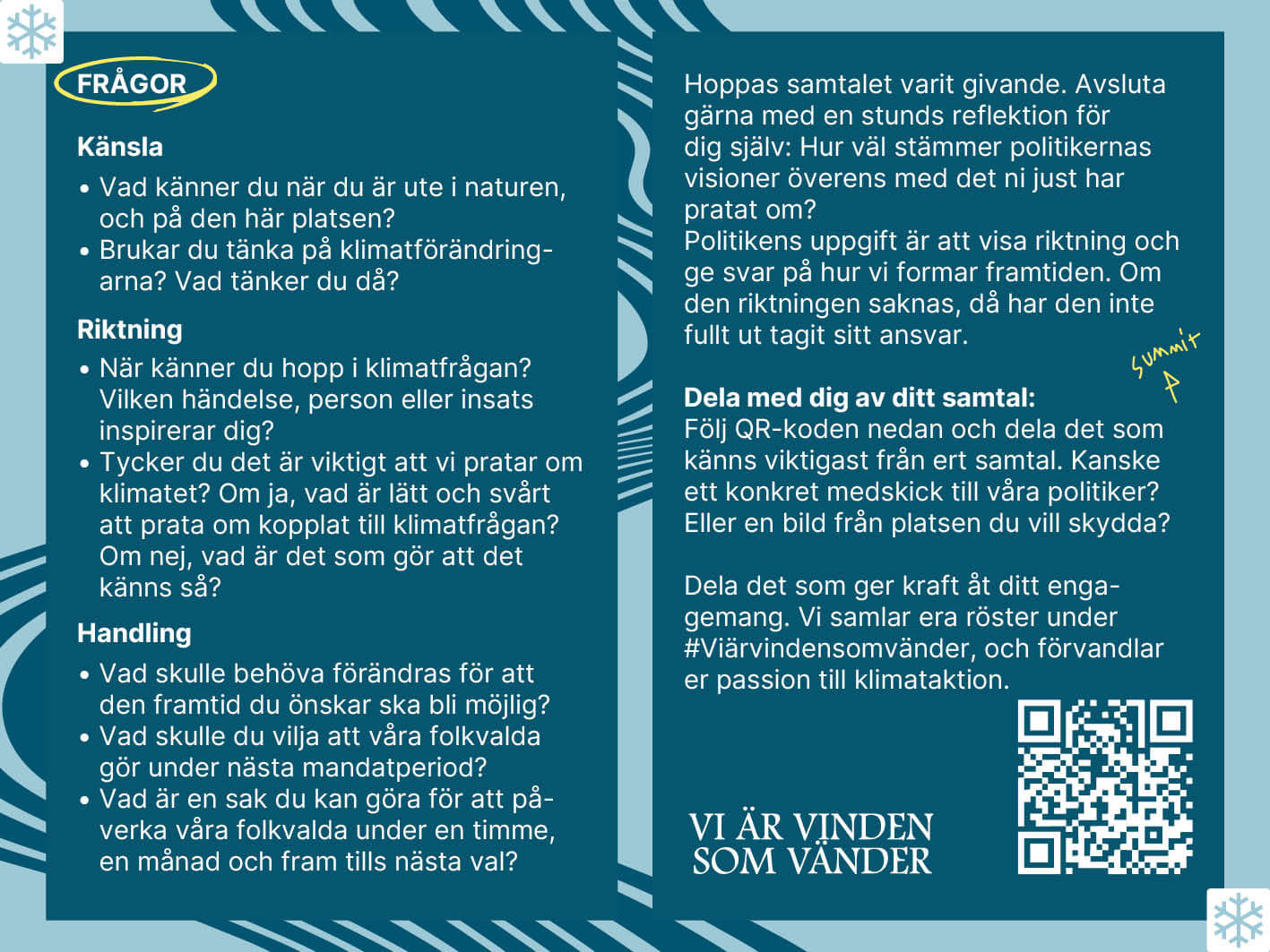 Dela gärna med dig av det som känns viktigast från ert samtal på länken här. Kanske ett konkret medskick till våra politiker? Eller en bild från platsen du vill skydda? Dela det som ger kraft åt ditt engagemang. Vi samlar era röster under #Viärvindensomvänder, och förvandlar er passion till klimataktion.